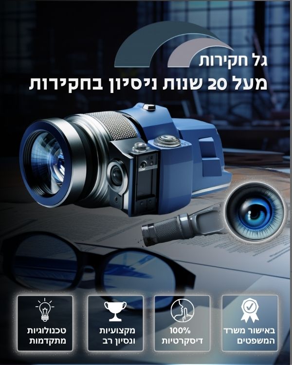 תפקידנו כחוקרים פרטיים הוא לספק לכם את המידע האמין והמדויק ביותר, כזה שמסיר את מסך הספקות ומתרגם אותם לעובדות מוכחות בשטח או לחלופין מפריך אותם באופן חד-משמעי. אנו עוסקים באיסוף ראיות איכותיות, קבילות ומבוססות, שיכולות לשמש אתכם בהליכים משפטיים, אך לא פחות חשוב- מעניקות לכם בהירות וכלים לקבלת החלטות מושכלות.